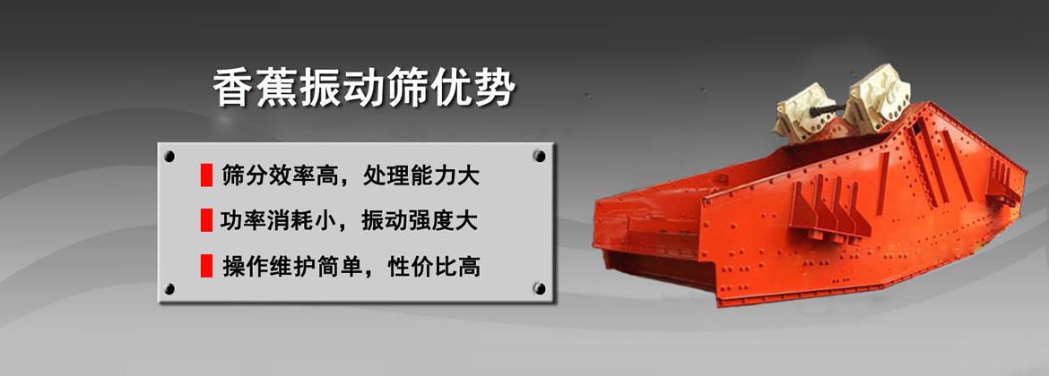 香蕉振動(dòng)篩在入料端有一斜坡面,先以34°開(kāi)始,緊接著以一定數(shù)目的角度下降到大約為10°的出料端為止。篩面采用不同傾角的折線形式,從入料端到出料端物料層厚度是不變。各段篩面上物料量與流速比值穩(wěn)定、料層較高,呈現(xiàn)均勻狀態(tài)篩分效率顯著提高,比相同有效面積篩分機(jī)的處理量提高1-2倍,對(duì)于細(xì)粒含量高,特別是物料中料度占分級(jí)粒度尺寸小于1/2的物料含量較大時(shí),香蕉型振動(dòng)篩分機(jī)具有極高的篩分效率。